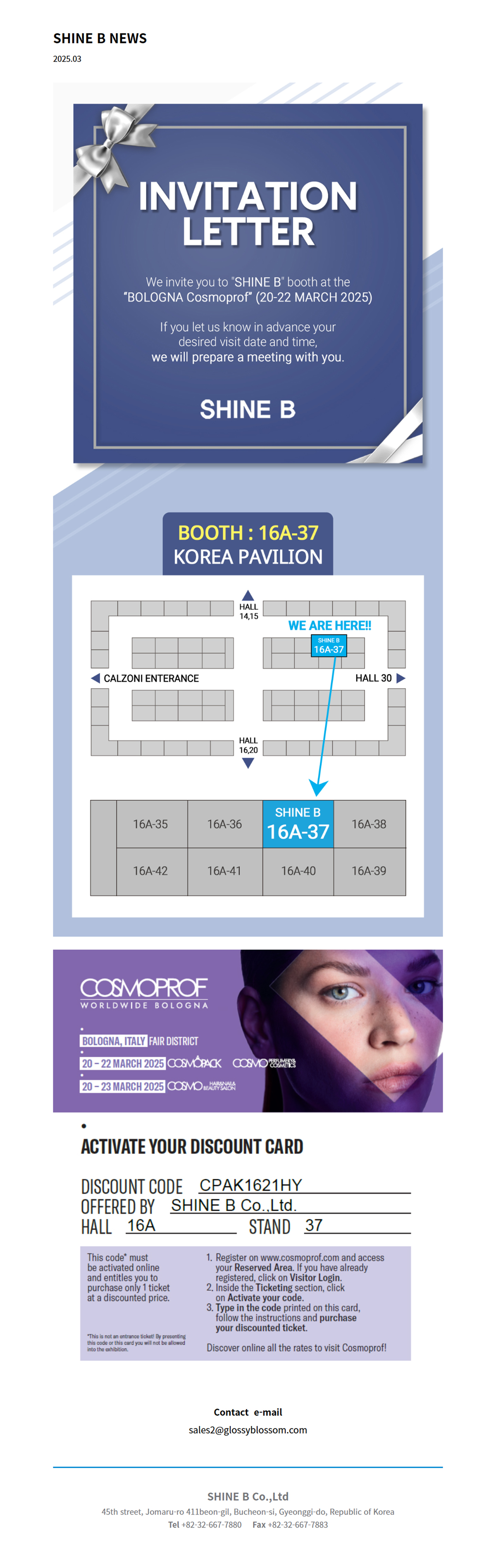 NEWSROOM Here are various news for SHINE B. NEWSROOM EXHIBITION POSTER VIDEO REVIEW [SHINE B NEWS] See you at BOLOGNA Cosmoprof_Incl. Discount Card 관리자 / 2025-03-13 Thumbnail 20250311 썸네일.jpg (대표) List top bottom