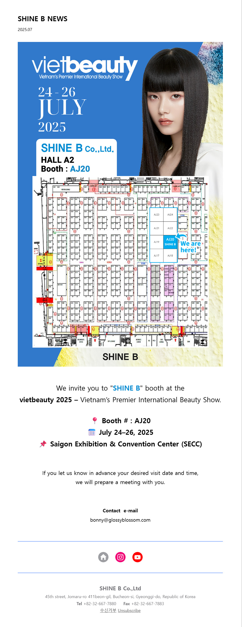 NEWSROOM Here are various news for SHINE B. NEWSROOM EXHIBITION POSTER VIDEO REVIEW [SHINE B NEWS] INVITATION LETTER - vietbeauty 2025 관리자 / 2025-10-31 [SHINE B NEWS] INVITATION LETTER - vietbeauty 2025 Thumbnail 2507_비엣젯.jpg (대표) List top bottom