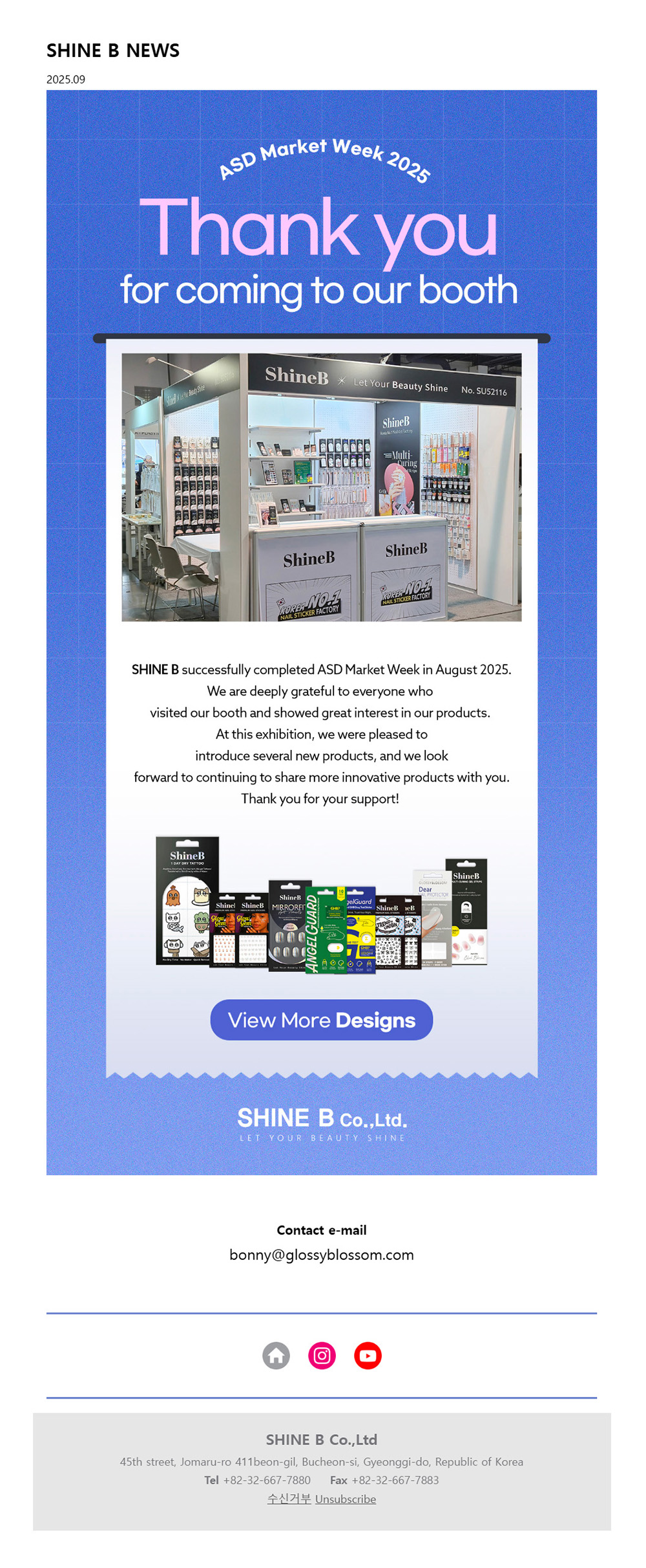 SHINE B Buyers FamilySite GLOSSYBLOSSOM KOREA GLOSSYBLOSSOM USA E-catalog Contact ENG kor eng ABOUT BRAND STORY HISTORY INFORMAION RESEARCH R&D OEM/ODM CERTIFICATE PRODUCT GEL SHINE STRIP SEMI-CURE GEL GELFIT STRIP NAIL STICKER TATTOO TOOLS MARKETING NEWSROOM EXHIBITION POSTER VIDEO REVIEW MARKETING NEWSROOM Here are various news for SHINE B. NEWSROOM EXHIBITION POSTER VIDEO REVIEW [SHINE B NEWS] Thank you to everyone at the ASD Market Week 2025 관리자 / 2025-10-31 [SHINE B NEWS] Thank you to everyone at the ASD Market Week 2025 Thumbnail 2509_ASD 땡큐.jpg (대표) List top bottom