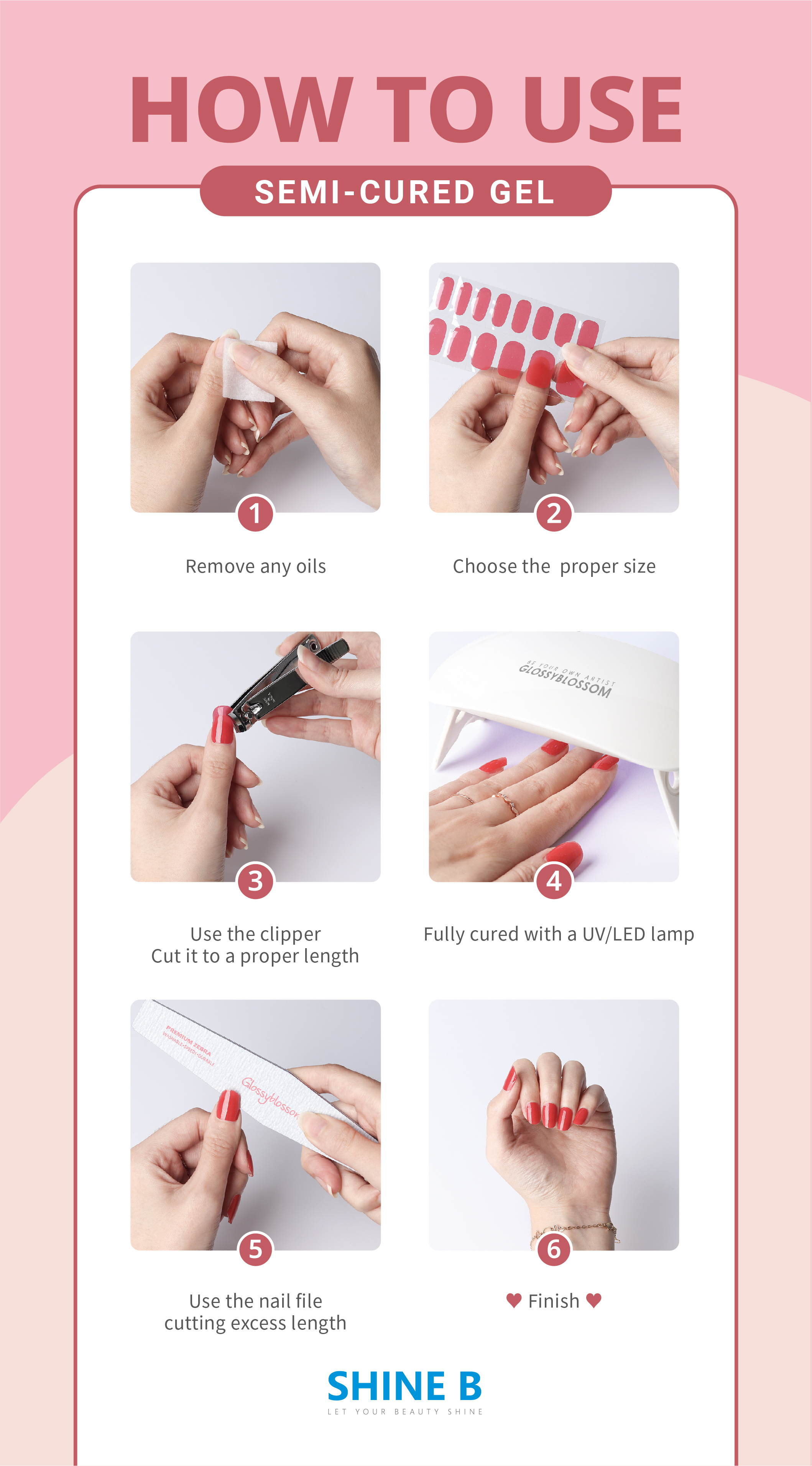 SHINE B Buyers FamilySite GLOSSYBLOSSOM KOREA GLOSSYBLOSSOM USA E-catalog Contact ENG kor eng ABOUT BRAND STORY HISTORY INFORMAION RESEARCH R&D OEM/ODM CERTIFICATE PRODUCT GEL SHINE STRIP SEMI-CURE GEL GELFIT STRIP NAIL STICKER TATTOO TOOLS MARKETING NEWSROOM EXHIBITION POSTER VIDEO REVIEW MARKETING POSTER Find SHINE B posters. NEWSROOM EXHIBITION POSTER VIDEO REVIEW HOW TO USE semi-cured gel 관리자 / 2022-11-25 HOW TO USE semi-cured gelContact Us Thumbnail 20221125 How to use 홈페이지용 썸네일-06-07.jpg (대표) List top bottom