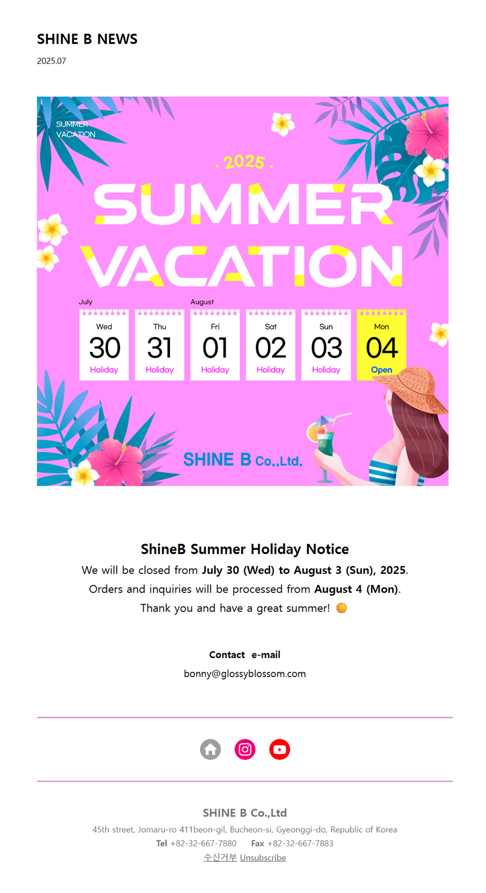 NEWSROOM (주)샤인비의 다양한 소식을 확인해 보세요. NEWSROOM EXHIBITION POSTER VIDEO REVIEW [SHINE B NEWS] Summer Holiday Notice 관리자 / 2025-10-31 [SHINE B NEWS] Summer Holiday Notice 썸네일 2508_여름휴가안내.jpg (대표) 목록 top bottom
