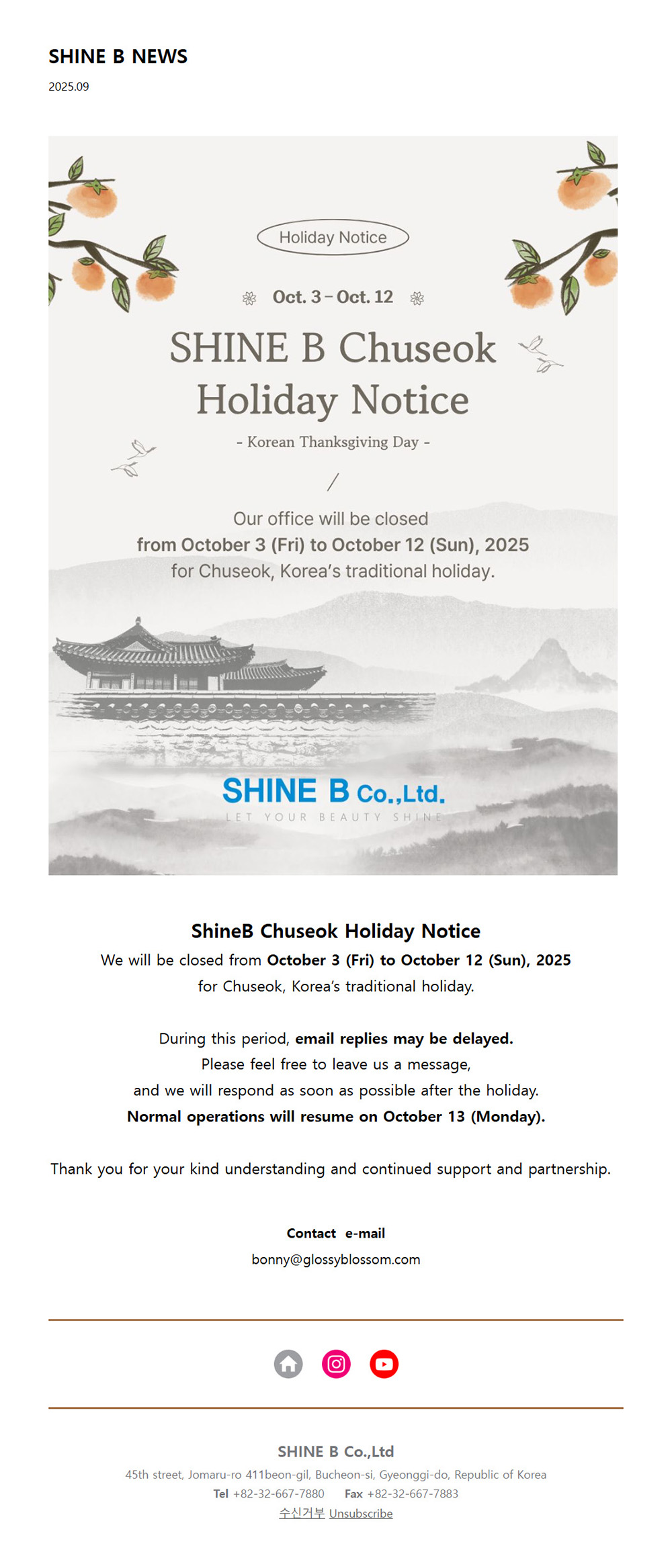 NEWSROOM (주)샤인비의 다양한 소식을 확인해 보세요. NEWSROOM EXHIBITION POSTER VIDEO REVIEW [SHINE B NEWS] Holiday Closure Notice: Chuseok 관리자 / 2025-10-31 [SHINE B NEWS] Holiday Closure Notice: Chuseok 썸네일 2509_추석 휴무안내.jpg (대표) 목록 top bottom