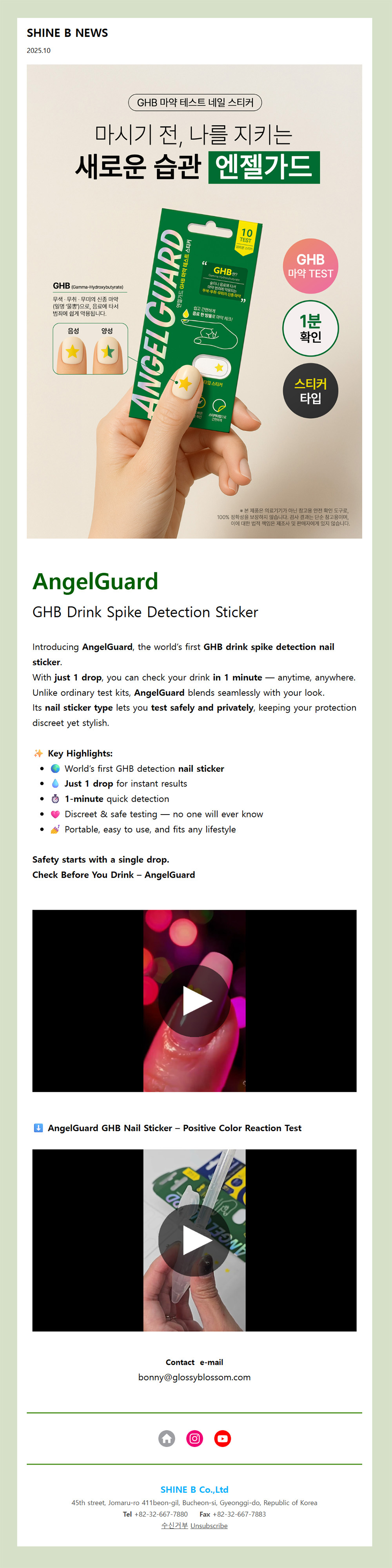NEWSROOM (주)샤인비의 다양한 소식을 확인해 보세요. NEWSROOM EXHIBITION POSTER VIDEO REVIEW [SHINE B NEWS] The first GHB detection nail sticker – AngelGuard 관리자 / 2025-10-31 [SHINE B NEWS] The first GHB detection nail sticker – AngelGuard 썸네일 2510_GHB 스티커.jpg (대표) 목록 top bottom